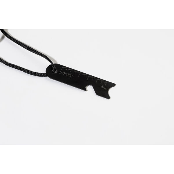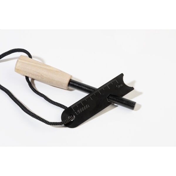 Survival fire starter tool met houten handvat en multifunctionele roestvrijstalen schraper uitgerust met een liniaal, flesopener en zeskantsleutel.