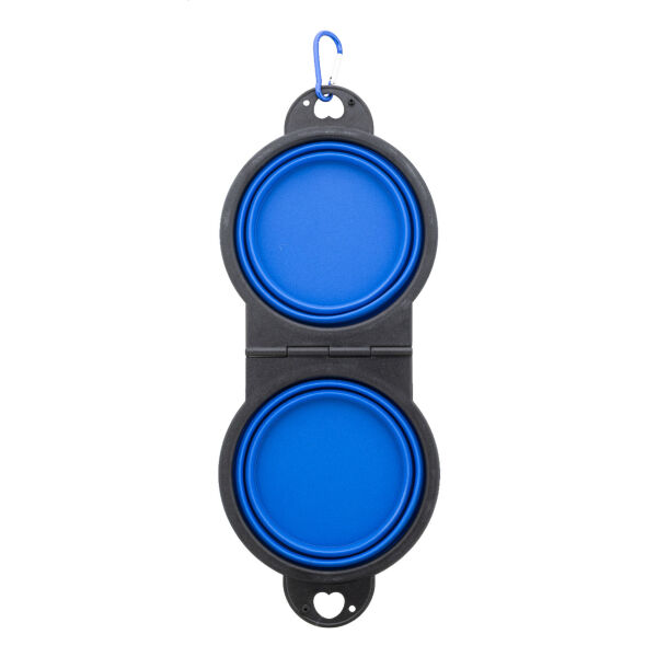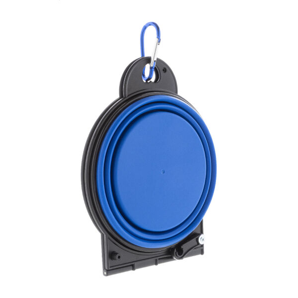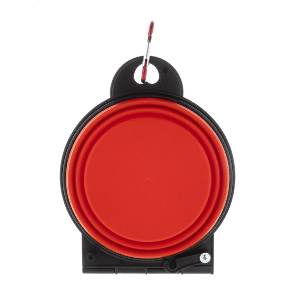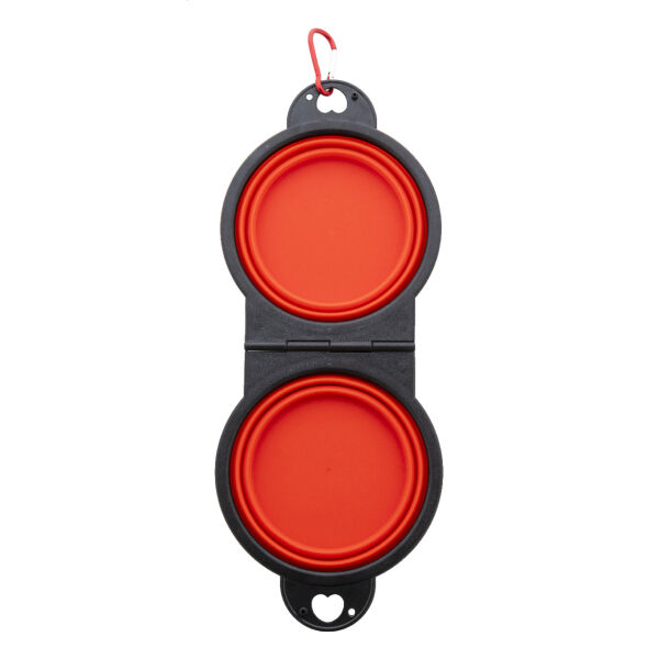 Opvouwbare huisdierenbak in duurzaam TPE met twee compartimenten van 450 ml en bijpassende aluminium karabijnhaak in kleur.
