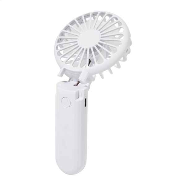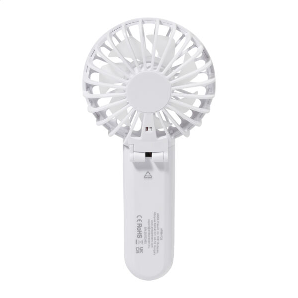 Gerecycleerde ABS elektrische handventilator met ingebouwde USB oplaadbare batterij (400 mAh). Met instelbare hoofdhoek en 3 snelheidsinstellingen. Inclusief USB lader kabel.