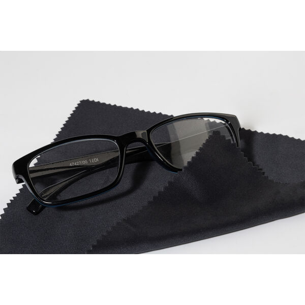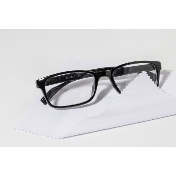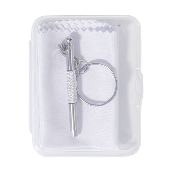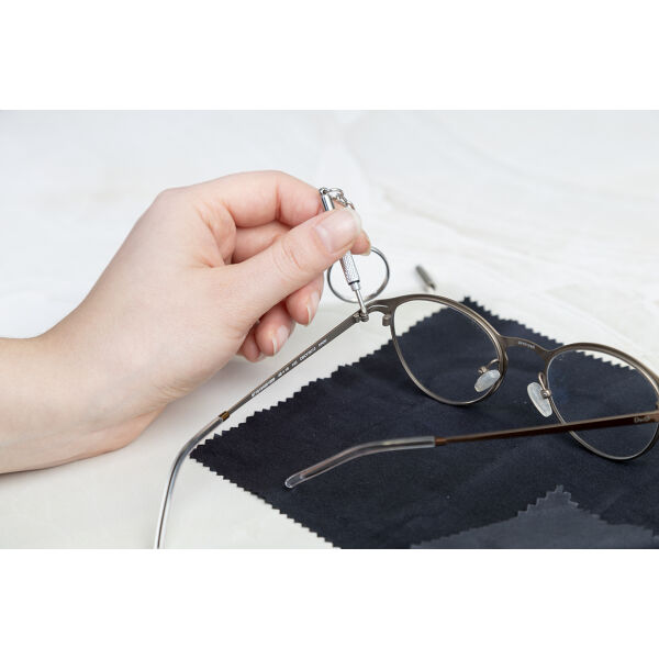 Compacte brillen reparatieset in transparante PP-doos. Inclusief 100% RPET microvezel (220 g/m²) reinigingsdoekje en minischroevendraaier met sleutelhanger. Doekmaat: 18×15 cm.