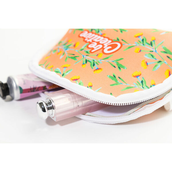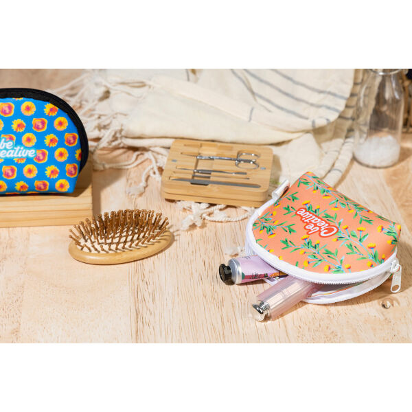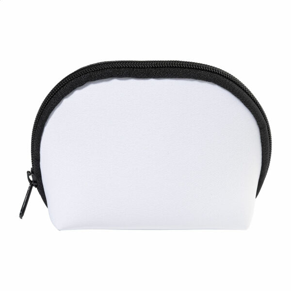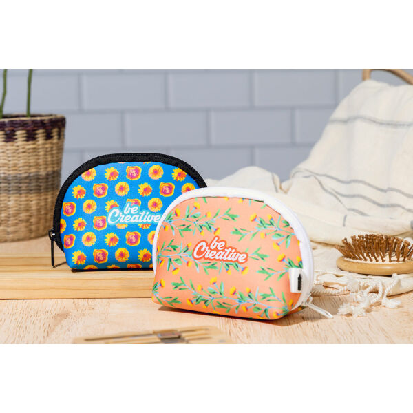Custon made toilettas met ritssluiting in RPET-neopreen. Met onderscheidend RPET-label met all over sublimatiebedrukking. MOQ: 50 stuks.