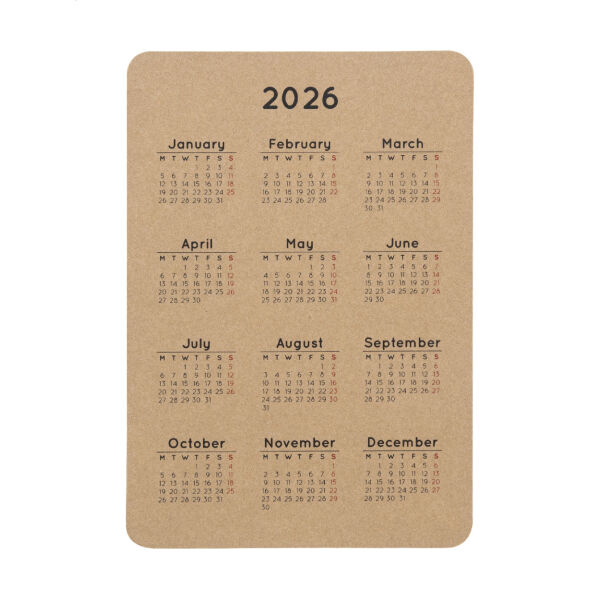 Custom made kraftpapierkaartkalender in zakformaat (300 g/m²) met afbeeldingen in kleur. Prijs is inclusief digitaal printen aan beide zijden. MOQ: 250 stuks.