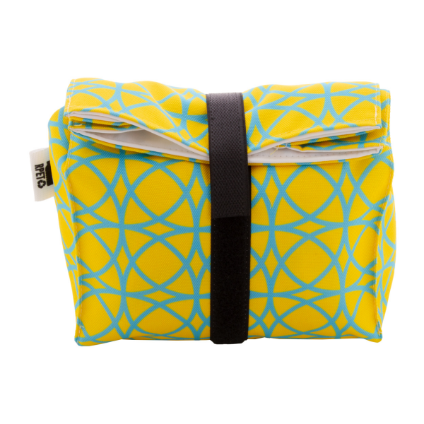 Custom made, herbruikbare rolltop snacktas van 600D RPET polyester met duurzame waterdichte voering en klittenbandsluiting. Ideaal voor het verpakken van snacks of een broodje. Met all-over sublimatie gedrukte afbeeldingen. MOQ: 25 stuks.