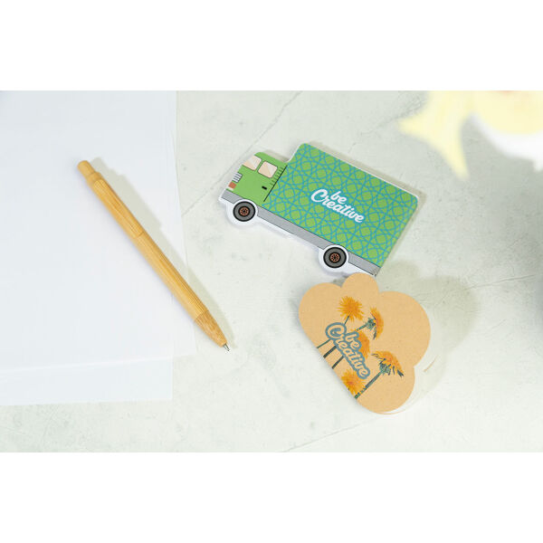 Custom made, met papier bedekt vrachtwagenvormig sticky notesblok. Inclusief 50 vellen plakbriefjes van gerecycled papier. Prijs is inclusief full colour bedrukte buitenomslag. MOQ: 100 stuks.