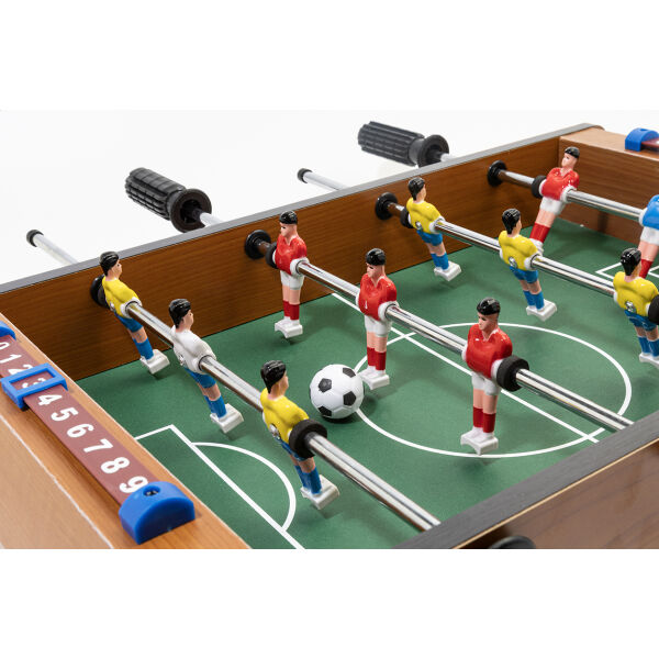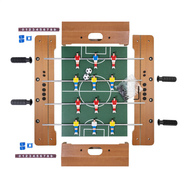 Mini tafelvoetbalspel gemaakt van MDF hout. Inclusief 2 ballen en scoretellerschuifregelaars. Wordt flat-packed geleverd, vereist assemblage.