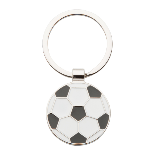 Metalen sleutelhanger in de vorm van een voetbal. Geleverd in een zwarte geschenkdoos.