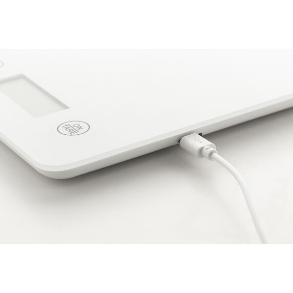 Digitale keukenweegschaal met weegplatform van gehard glas en ingebouwde oplaadbare USB-batterij (200 mAh). Capaciteit: 5 kg, graduatie 1 g, meeteenheden: g/oz. Met water/melk ml indicator. Inclusief USB lader kabel.